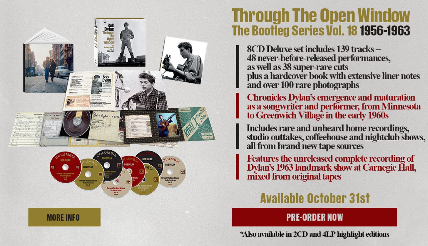 The Bootleg Series. Bob Dylan – Through the Open Window: 1956–1963 (Bootleg Series Vol. 18) will be released on October 31, 2025.