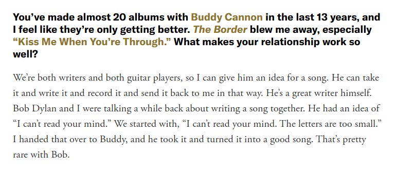 Another story this week came from Willie Nelson, who mentioned in an interview that he and Bob Dylan had exchanged ideas for a possible song a while back. Nelson explained that Dylan gave him a line built around the idea “I can’t read your mind,” followed by the thought that “the letters are too small.” Willie passed this small spark to his longtime collaborator Buddy Cannon, who shaped it into a complete song.