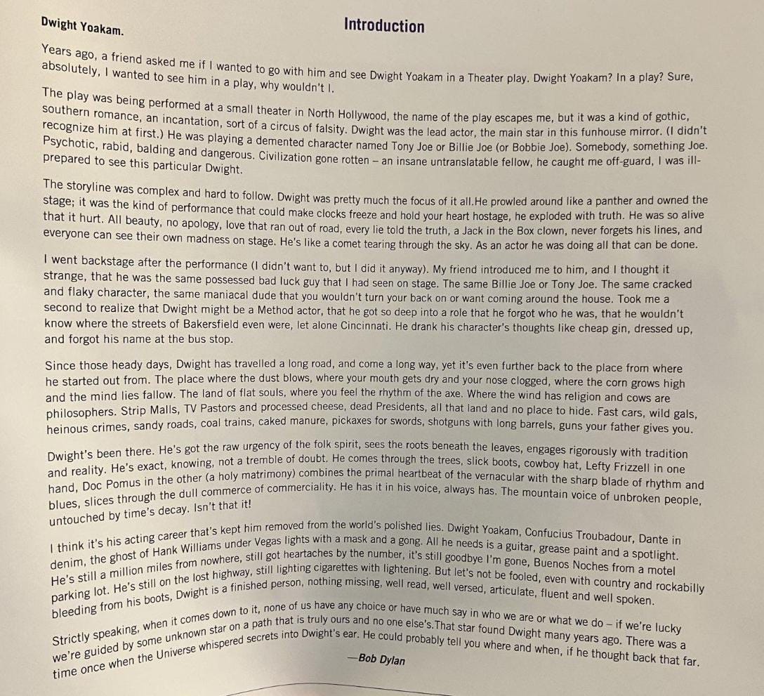 This week brought a rare surprise. Bob Dylan wrote a set of liner notes for a special 4-LP box set by Dwight Yoakam, issued for Record Store Day. The box is titled And Then I Wrote… The First Three Albums Of The ’90s. In the text you will see in the image Dylan moves in long, rolling sentences that feel part memory and part myth. He describes Yoakam on stage like a panther, full of electric energy. He writes of performances that “took your breath away and stopped the heart,” of truth exploding with beauty, of a man so alive it hurt. He shifts from recollections of a small theater in North Hollywood to reflections on Yoakam’s entire artistic journey. The writing is poetic, dense, playful, full of vivid metaphors.