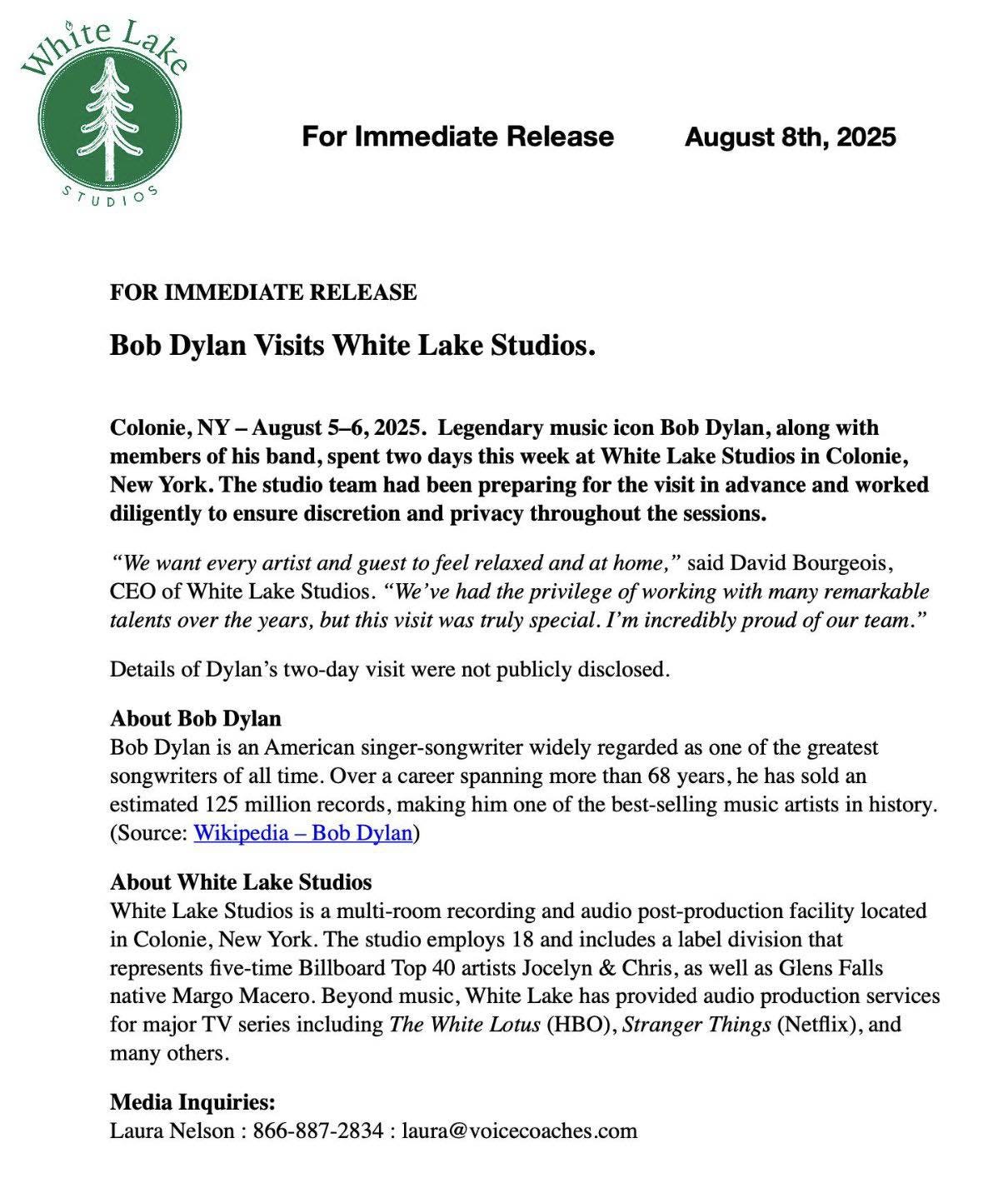 Amid the Outlaw dates, White Lake Studios (Colonie, NY) issued a press note stating that Bob Dylan and members of his band spent two days at the facility, Aug. 5–6, 2025, with sessions conducted discreetly. No details on repertoire or purpose were disclosed.